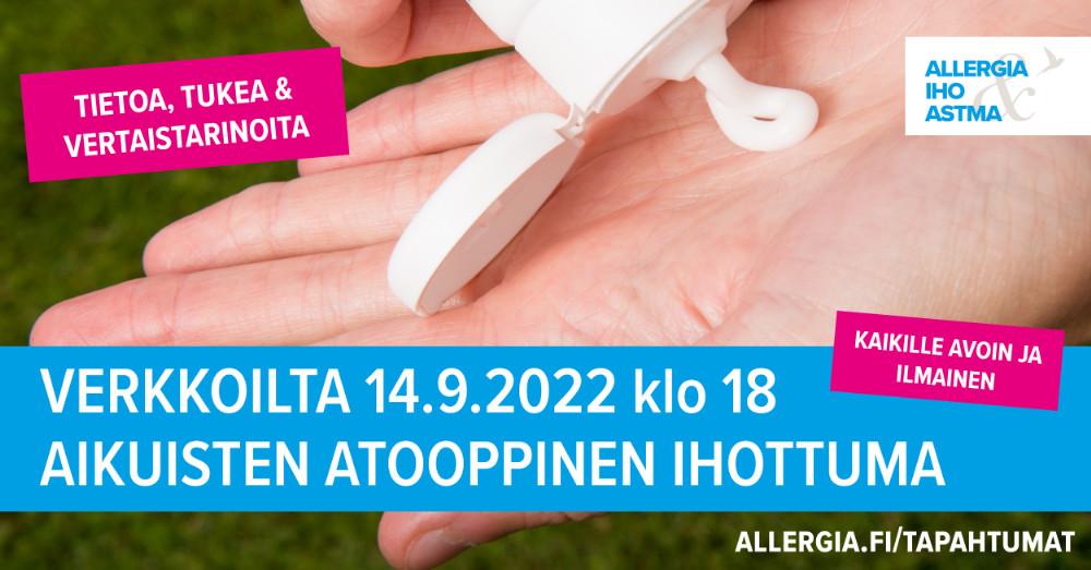 Tervetuloa mukaan osallistumaan Allergia-, iho- ja astmaliiton järjestämään verkkoiltaan, jossa teemana aikuisten atooppinen ihottuma. Ohjelmassa on ihotautien erikoislääkäri Laura Korhosen puheenvuoro atooppisesta ihottumasta ja sen hoidosta. Lisäksi on mahdollisuus esittää chätissä kysymyksiä lääkärille.
