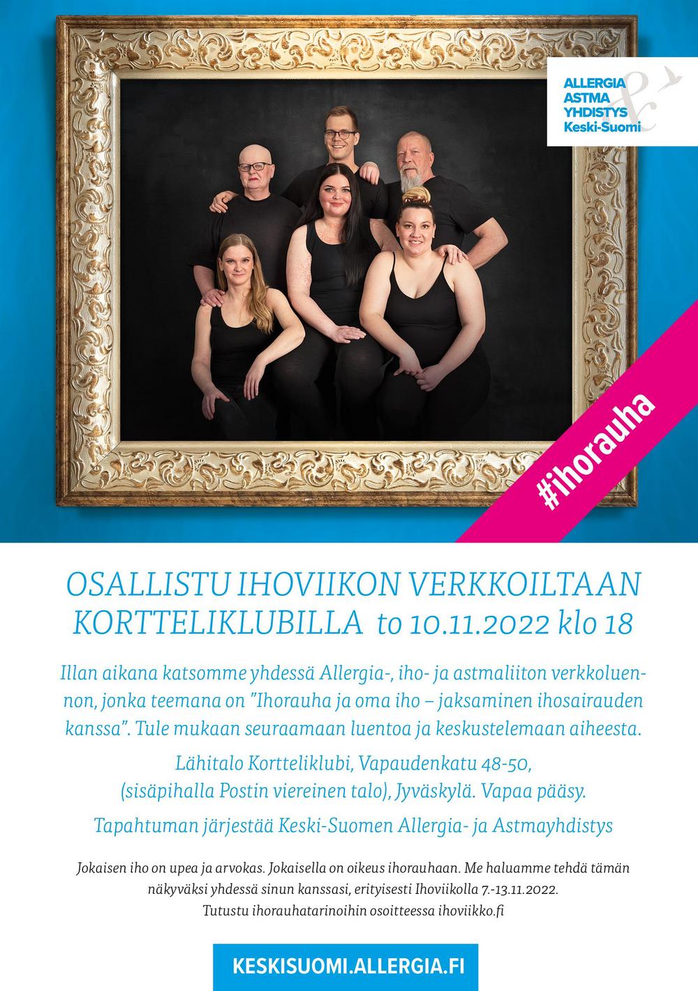 Kaikille avoin tietoa, tukea ja vertaistarinoita tarjoava verkkoilta, Ihoilta pidetään torstaina 10.11. klo 18-19. Tapahtumaan ei ole ilmoittautumista.