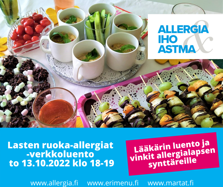 Tule Lasten ruoka-allergiat -verkkoluennolle to 13.10. klo 18.00-19.00 saamaan lisää tietoa ja ymmärrystä lasten ruoka-allergioista sekä nappaamaan vinkkejä allergialapsen synttäritarjoiluihin ja arkeen!